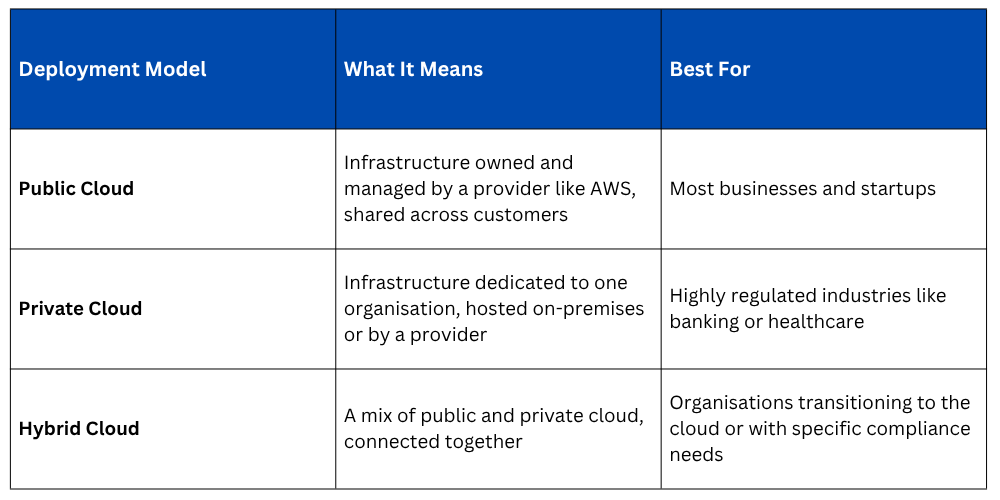 Before we get into service models, it helps to understand how cloud environments are deployed. There are three main types: