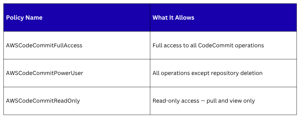 Because CodeCommit is an AWS service, access is controlled entirely through IAM. This is fundamentally different from GitHub, where access is managed through GitHub accounts and teams.