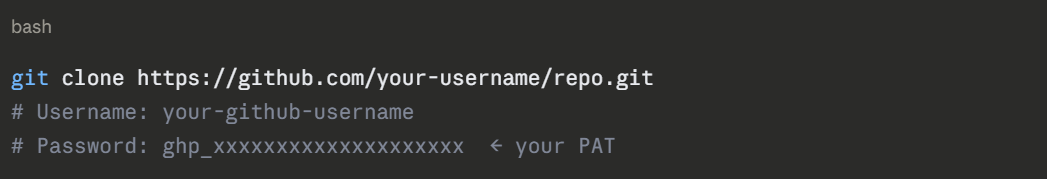 When Git prompts for a password, enter the token instead: