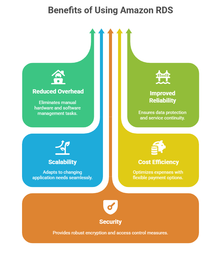 5. Security: Integration with AWS Identity and Access Management (IAM) ensures fine-grained access control. RDS databases can be deployed within Amazon Virtual Private Clouds (VPCs) for network isolation and use encryption at rest (AWS KMS) and in transit (TLS) to protect sensitive data.