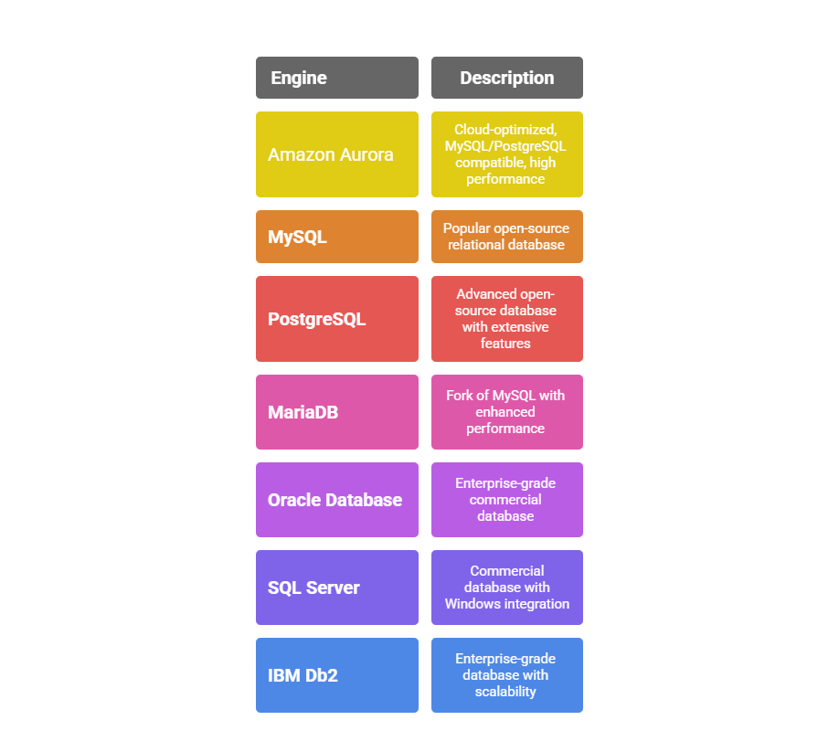 Amazon RDS supports seven major database engines, providing flexibility to choose based on application requirements and existing expertise: