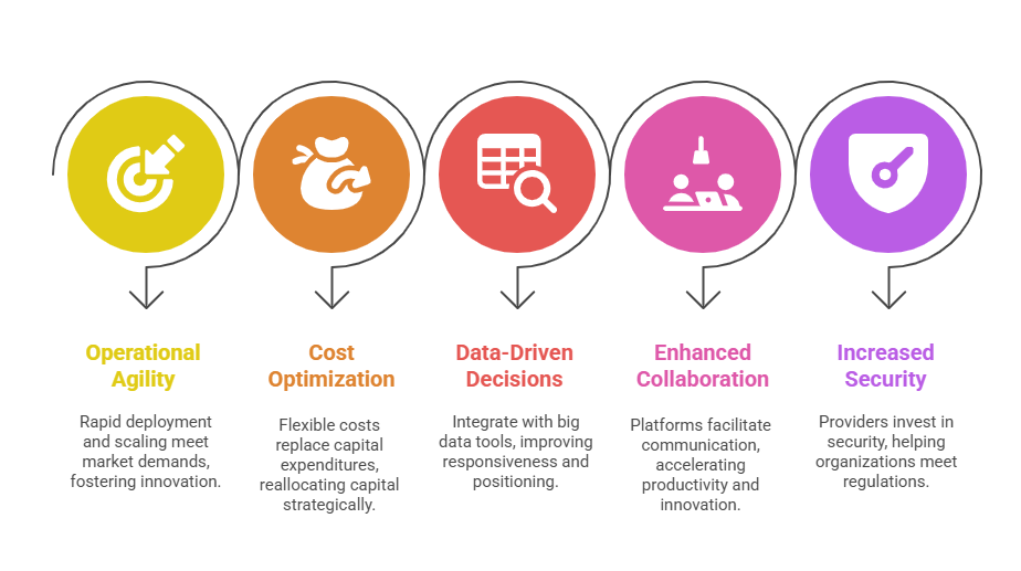 1. Operational Agility: Cloud enables rapid deployment of new services and scaling of operations to meet market demands without the delays and costs associated with traditional infrastructure. This agility fosters innovation, allowing businesses to test and launch new ideas faster.