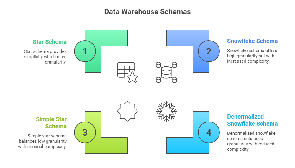Advantages: Enhanced query performance, intuitive structure for business users, and supports drill-down analysis.
