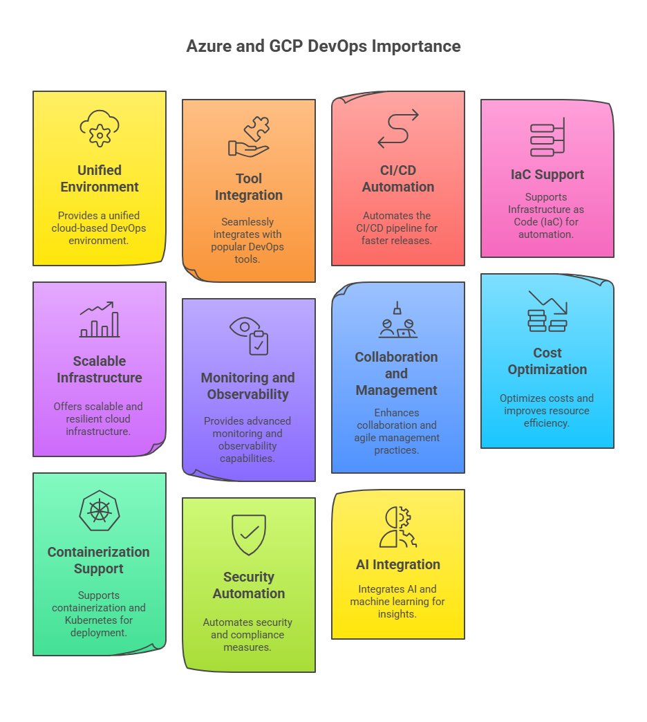In the modern era of cloud computing and automation, Microsoft Azure and Google Cloud Platform (GCP) have become two of the most significant players in enabling and advancing DevOps practices. Both platforms offer a wide range of integrated services and tools that support automation, continuous integration, continuous delivery, infrastructure management, and monitoring. Their ecosystems are designed to help organizations implement DevOps principles effectively by combining development and operations workflows in a seamless, scalable, and automated environment.The importance of Azure and GCP in DevOps lies in their ability to deliver end-to-end automation, cross-platform integration, intelligent analytics, and rapid scalability, all while ensuring reliability and high availability. They empower teams to deploy applications faster, monitor systems in real-time, and continuously improve performance based on data-driven insights.Below are the key points explaining the importance of Azure and GCP in DevOps