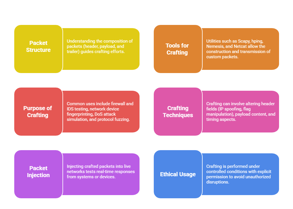 Packet crafting, on the other hand, is the process of creating and sending custom network packets to test how systems respond under various conditions or to exploit weaknesses.
