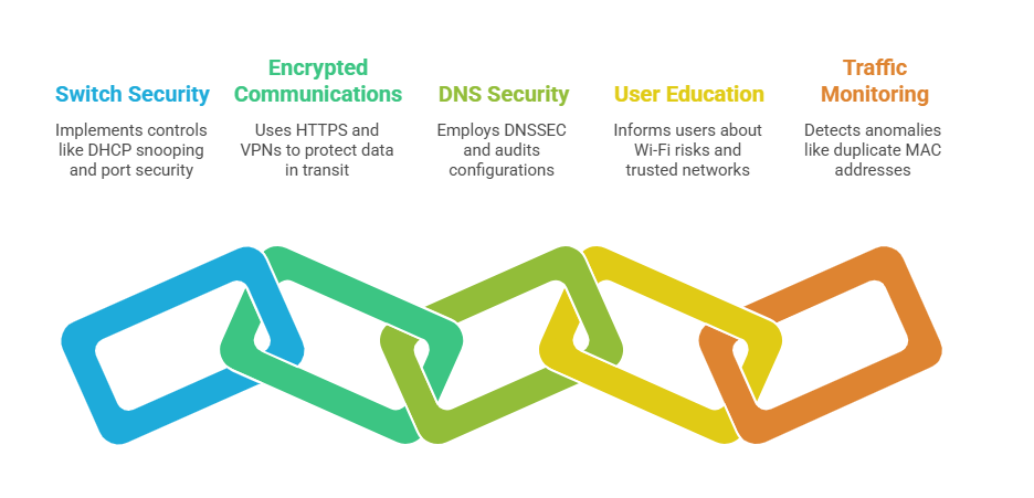Detection and Prevention: Techniques include static ARP entries, dynamic ARP inspection on managed switches, and using encryption to prevent unencrypted data interception.
