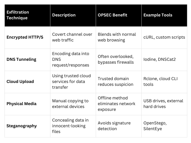 This dual focus on exfiltration methods and OPSEC principles is essential to conducting assessments safely and effectively.