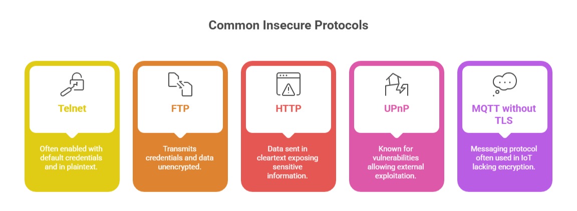 Mitigation: Adopt secure alternatives (SSH, SFTP, HTTPS, MQTT over TLS), enforce strong encryption, and disable unused services.