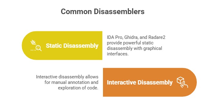 2. Disassemblers generate mnemonics and operands from binary instructions without altering execution.