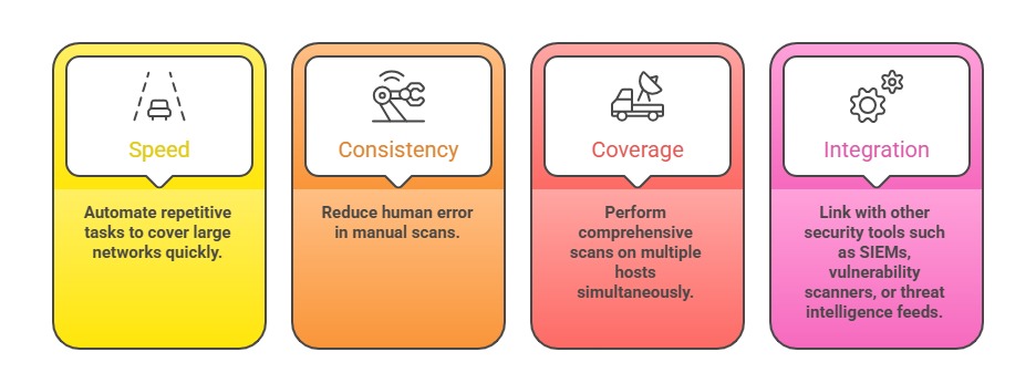 Automating these processes enhances efficiency, consistency, and coverage, allowing security professionals and penetration testers to perform rapid, large-scale assessments with minimal manual effort.