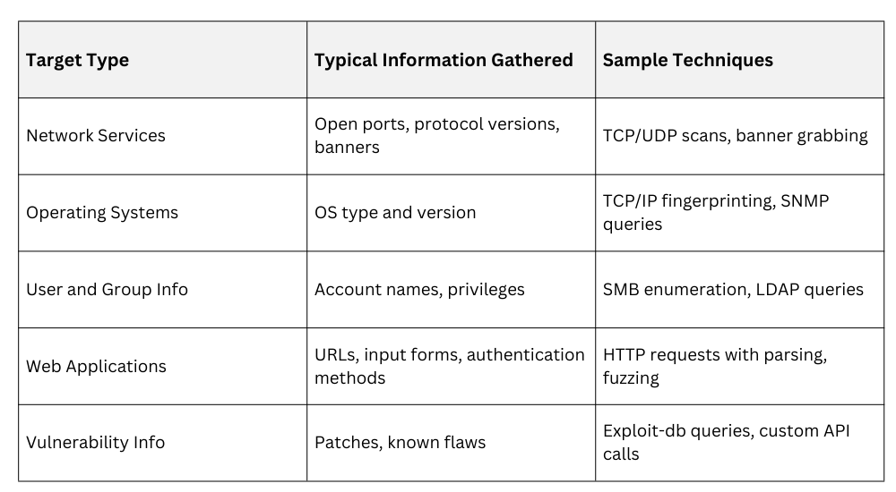1. Target Identification: Focus your script on defining the enumeration target type such as IP ranges, hostnames, ports, or service endpoints.