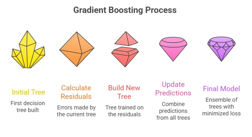 Example: A Gradient Boosting model predicting housing prices improves with every iteration by correcting earlier underestimations or overestimations, ultimately delivering highly accurate predictions.