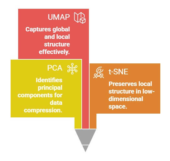 PCA, t-SNE, and UMAP represent three widely adopted approaches, each optimized for different analytical goals.