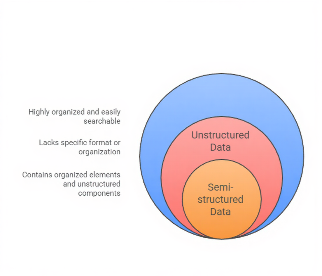 Semi-structured data bridges the gap by offering enough organization to parse but still containing flexible components that need preprocessing logic.
