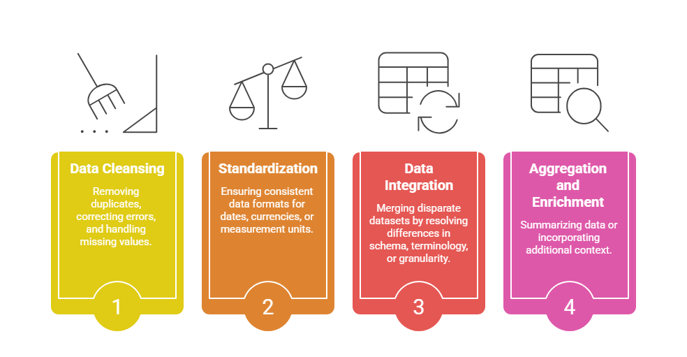 Business rules and calculations are applied to derive new metrics or categorize data. This stage enhances data quality and usability, enabling accurate analytics and reporting.