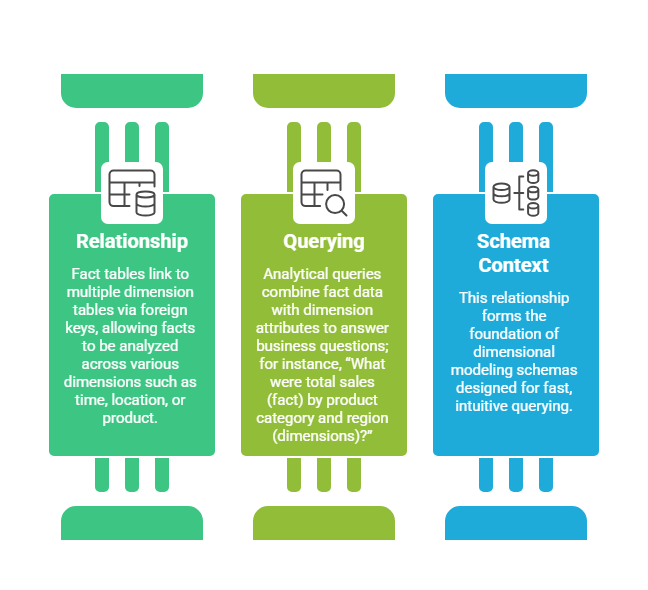 In dimensional modeling, facts and dimensions complement each other to support fast, intuitive analysis. The following points outline how they integrate: