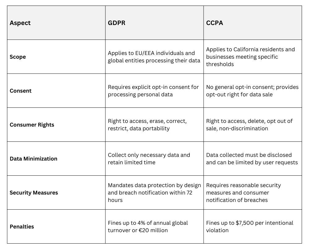 GDPR: Enforced since 2018, GDPR governs personal data protection for individuals within the EU and European Economic Area (EEA). It emphasizes explicit consent, data minimization, transparency, and comprehensive individual rights over data.