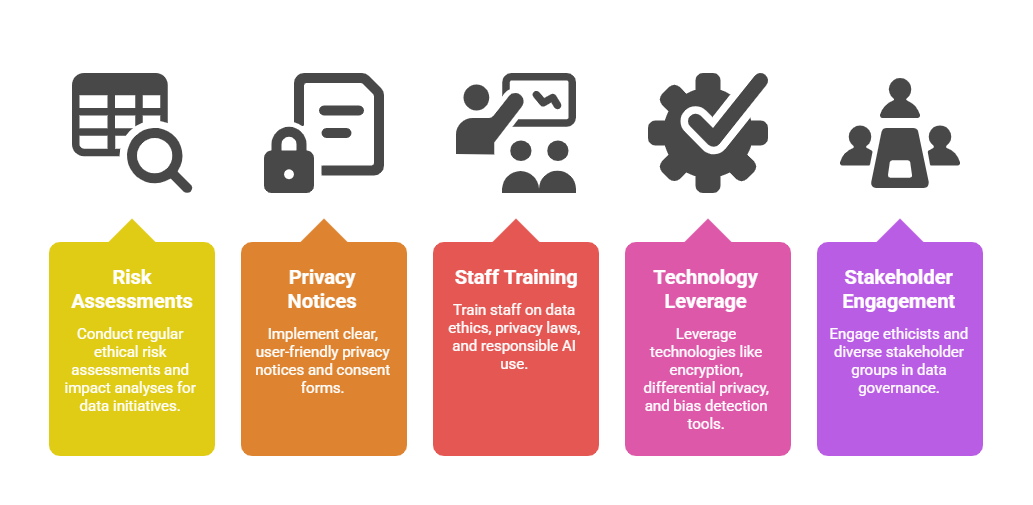 From staff training to technological safeguards, ethical data use relies on proactive measures. The following practices can help embed ethics into everyday data workflows.
