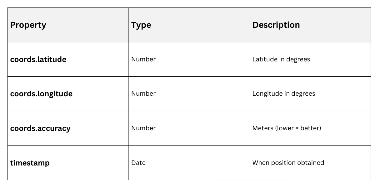 Supported in 98% of browsers (2025 data), it returns latitude/longitude with accuracy estimates.