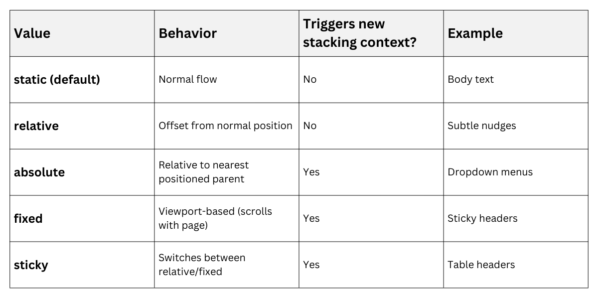 Positioning controls element placement relative to others or the viewport. Choose from static, relative, absolute, fixed, or sticky based on layout needs.