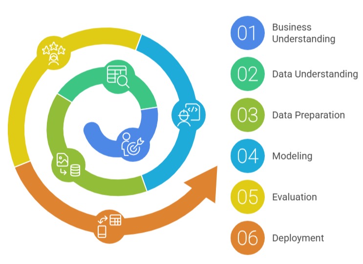 6. Deployment: Integrate the solution into real workflows, dashboards, or applications, followed by monitoring and maintenance. CRISP-DM is popular because it is flexible, industry-neutral, iterative, and easy to understand. It emphasizes the importance of continuously revisiting previous steps as new insights emerge.