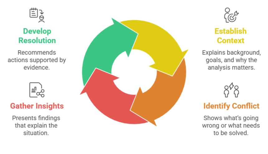 Unlike simple reporting, data storytelling aims to guide the audience through a logical journey—from understanding the context to recognizing the problem, interpreting the analysis, and finally embracing the recommended actions.