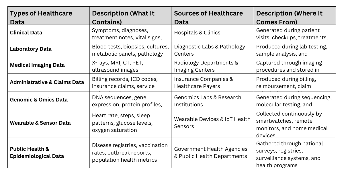 This data comes from multiple origins, including patients, healthcare providers, medical devices, and administrative systems.
