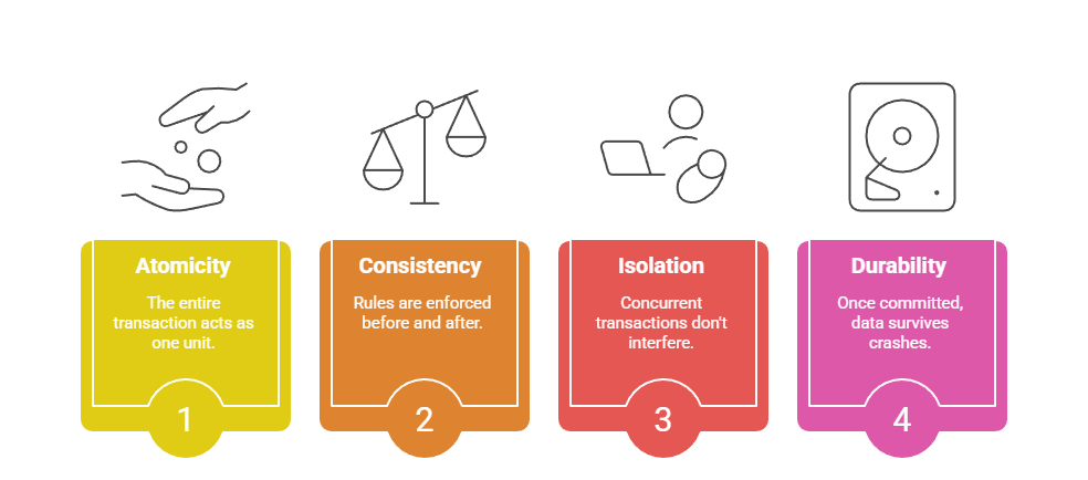 Example in Web Dev: In a JavaScript shopping app using MySQL, ACID ensures that when a user checks out, inventory decreases and payment records update atomically—no half-empty stock glitches.