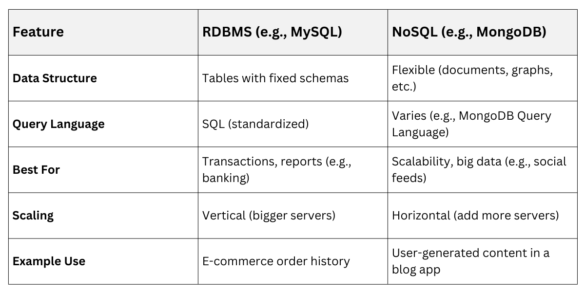 RDBMS like MySQL or PostgreSQL organize data into tables with rows and columns, enforcing relationships via keys. They're ideal for apps needing complex queries, such as a JavaScript dashboard pulling related user orders and profiles.