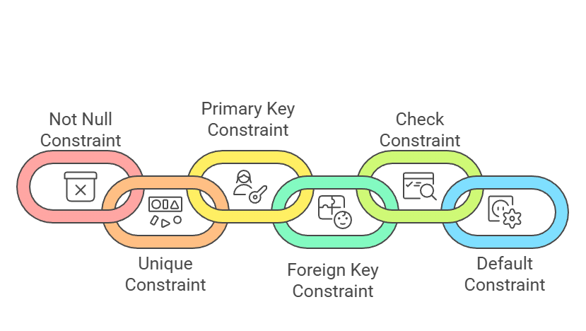 1. NOT NULL: Ensures a column always has a value. Example: name VARCHAR(100) NOT NULL.