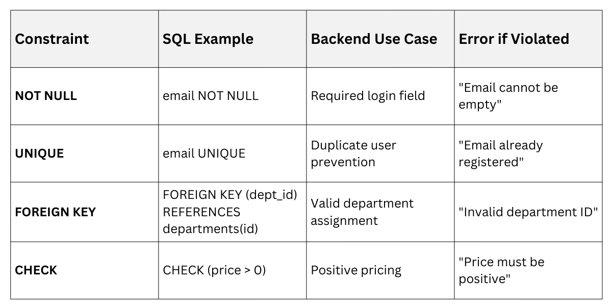 2. UNIQUE: Prevents duplicates across rows. Example: Email must be one-of-a-kind.