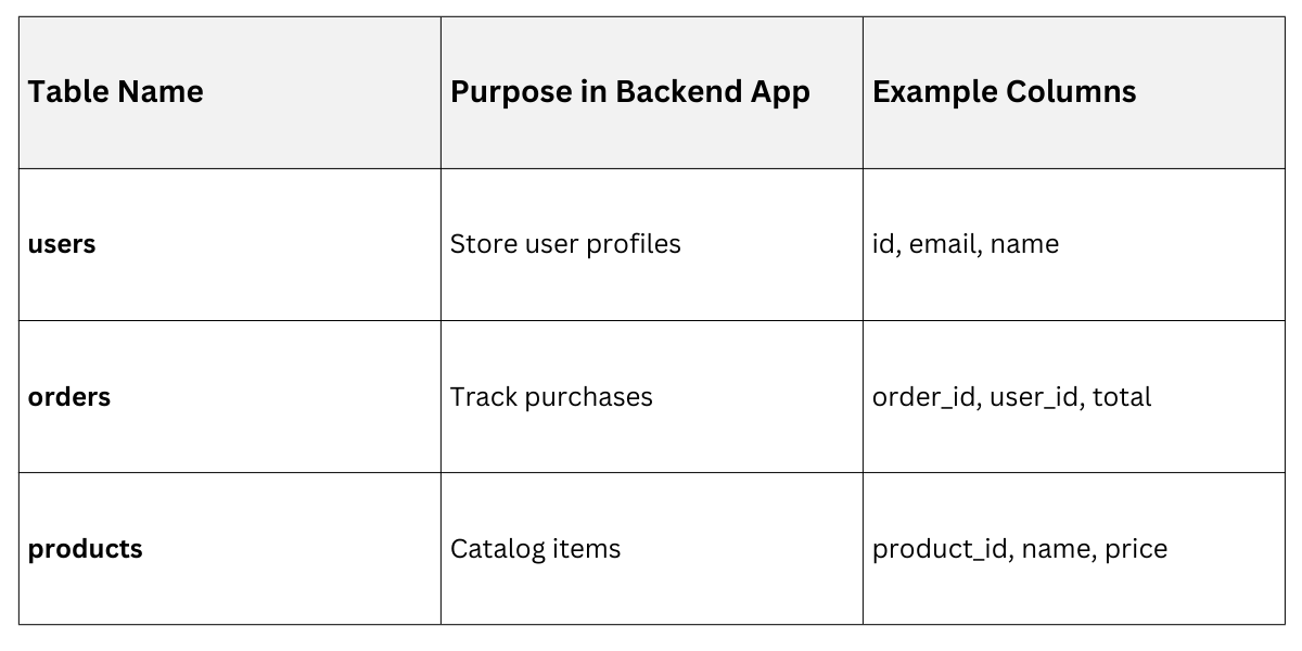 In practice, when designing a backend for a blog app, you'd create a posts table to store articles, ensuring all entries share columns like title and content.