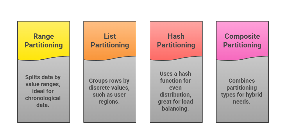 Databases offer several partitioning strategies, each suited to specific data patterns. Choose based on your query patterns and data growth.