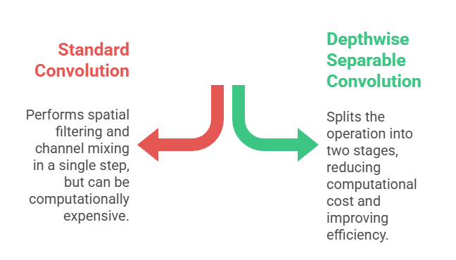 Unlike standard convolutions, which perform spatial filtering and channel mixing in a single step, depthwise separable convolutions split the operation into two stages