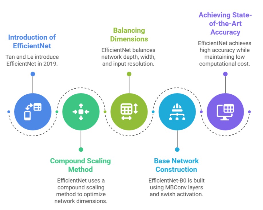 By applying compound scaling, EfficientNet variants (B1–B7) scale systematically according to available computational resources, maintaining accuracy improvements without excessive parameter growth.