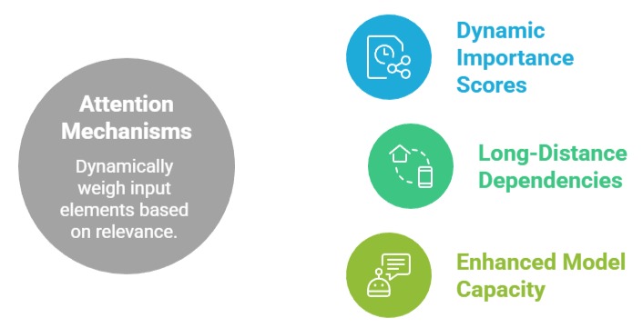 Attention mechanisms address these issues by assigning weights to different elements of the input, allowing the network to prioritize important information while ignoring less relevant content.