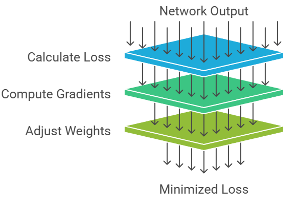 Once the output is produced, a loss function evaluates how far the prediction is from the true target and assigns a numerical value representing the model’s error. This error becomes the foundation for backward propagation.