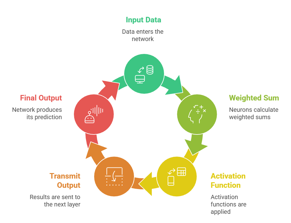 Forward propagation is the stage where data flows from the input layer toward the output layer, undergoing transformations at every step.