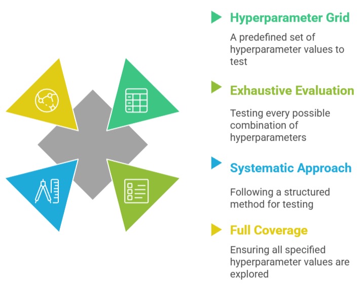 Grid search exhaustively evaluates all possible combinations of hyperparameters specified in a predefined grid.