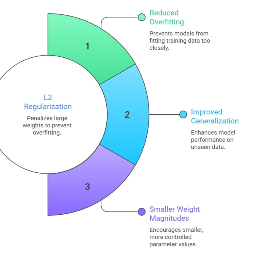 By constraining weight magnitudes, L2 regularization prevents any single feature from dominating the model’s predictions.