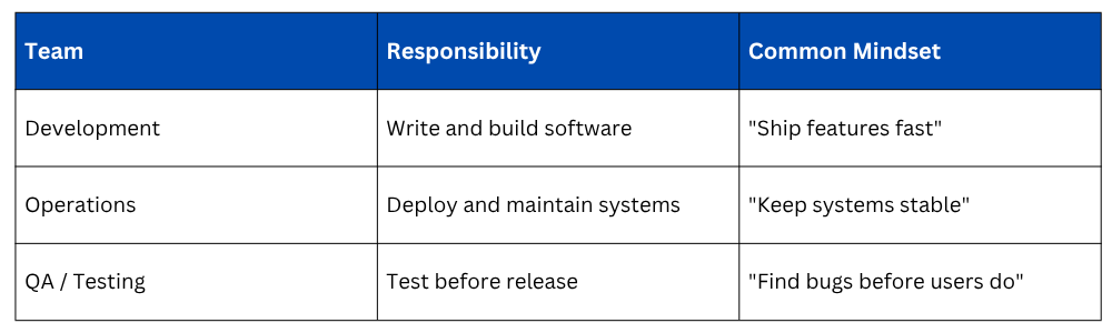 In traditional IT environments, development and operations teams worked in silos — separately, with very little communication. Here is what that typically looked like: