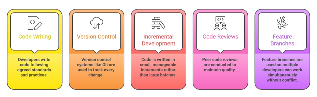 This is where developers write the actual code for the application or feature. In DevOps, coding is done in a collaborative and disciplined way.