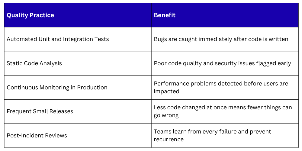 DevOps does not treat quality as a final checkpoint before release. Instead, quality is built into every stage of the development process through automated testing, code reviews, and continuous monitoring.