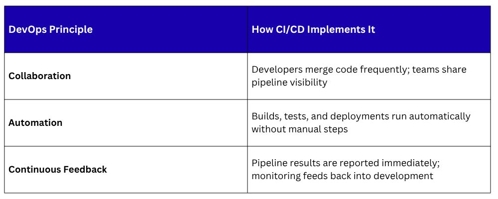 CI/CD is not a separate concept from DevOps — it is one of its most concrete and practical expressions. The three core DevOps principles map directly onto CI/CD: