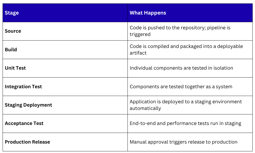 2. Build Stage: The application is compiled, dependencies are resolved, and the code is packaged into a deployable artifact — such as a JAR file, Docker image, or binary.