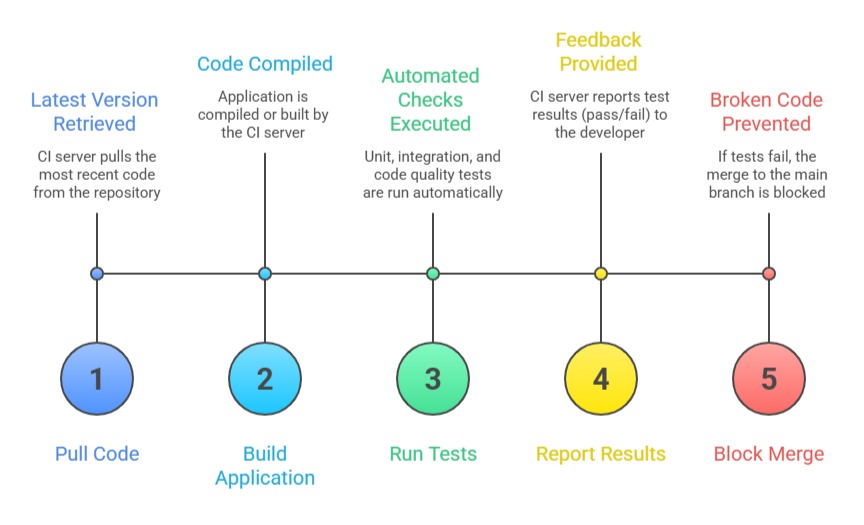 Every time a developer pushes code to the shared repository, the CI system automatically: