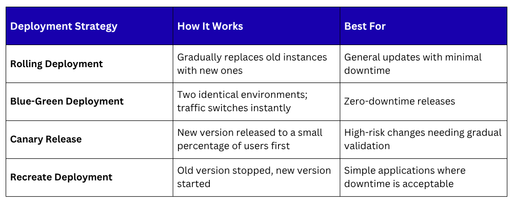 Production deployments in modern pipelines use safe strategies to minimize risk: