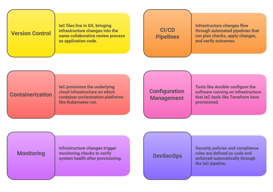 IaC does not exist in isolation, it is deeply connected to and reinforces every other DevOps practice: