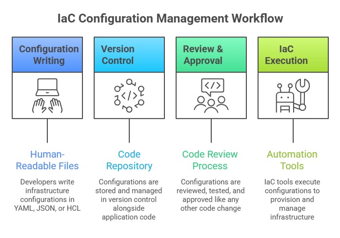 Once infrastructure is provisioned, configuration management tools handle installing software, applying settings, and maintaining the desired state of the operating system and applications running on that infrastructure.