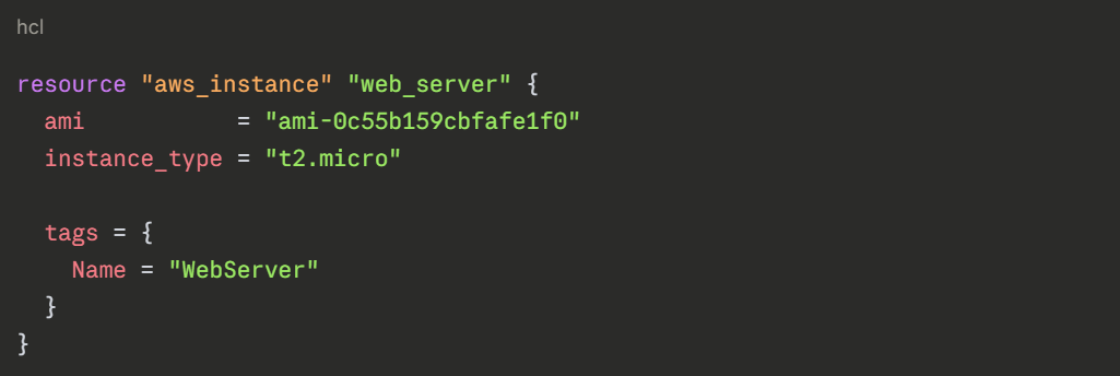 The resource type (aws_instance) tells Terraform what kind of infrastructure to create. The local name (web_server) is used to reference this resource elsewhere in the configuration.